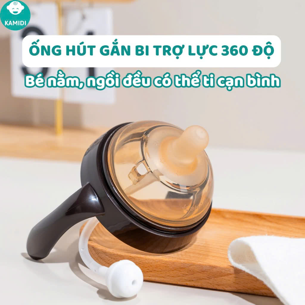 - Ống hút gắn bi trọng lực linh hoạt xoay 360 độ cho phép bé bú sữa ở mọi tư thế.