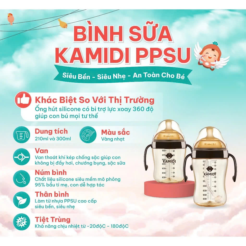 Bình sữa Kamidi PPSU họa tiết là lựa chọn lý tưởng cho các bé đang tập bú bình hoặc chuyển giai đoạn từ bú mẹ sang bú bình. Sản phẩm thuộc dòng bình sữa cao cấp của Kamidi, được nhiều mẹ Việt tin dùng nhờ thiết kế an toàn, thông minh và độ bền vượt trội. Bên cạnh đó, bình sở hữu rất nhiều ưu điểm khiến bé dễ dàng hợp tác và thích mê chỉ sau vài lần thử.