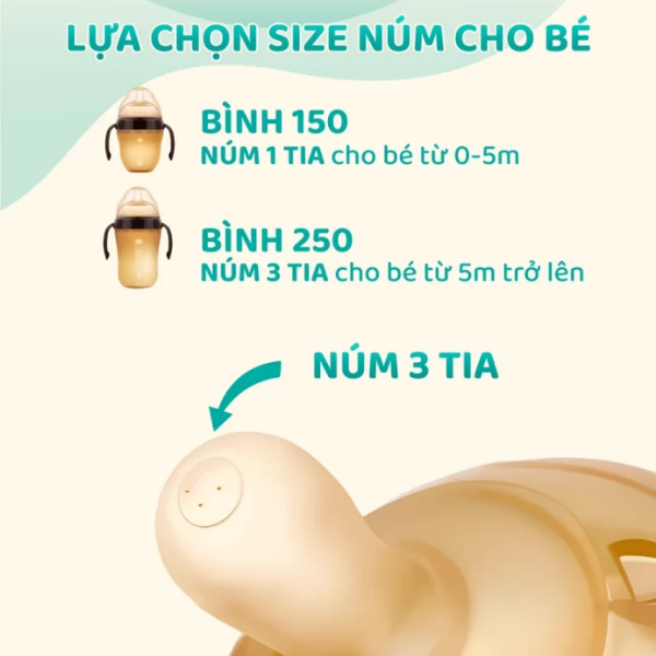 - Dung tích: Bình 150ml núm 1 tia và bình 250ml núm 3 tia