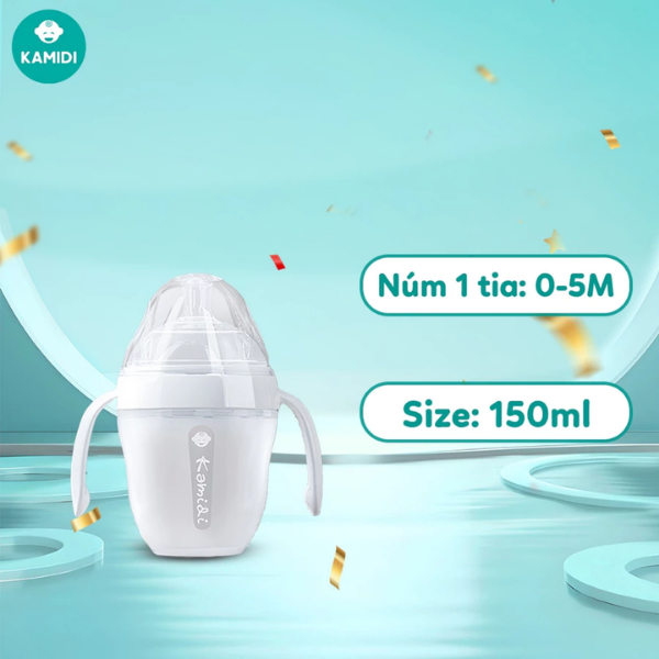 - Bình Kamidi Silicone 150ml: Núm đi kèm 1 tia dành cho bé từ 0 – 5 tháng, tốc độ chảy chậm.