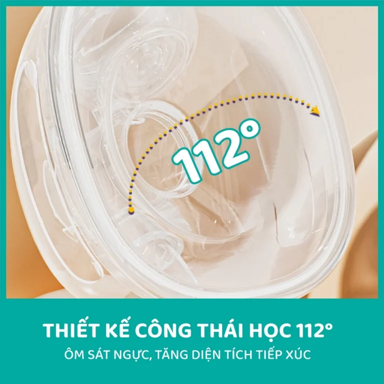 - Màng hút silicone công thái học với góc rộng 112 độ, tăng diện tích tiếp xúc ngực lên 20%, giúp ôm sát, tạo cảm giác thoải mái và tăng gấp đôi hiệu suất hút sữa.